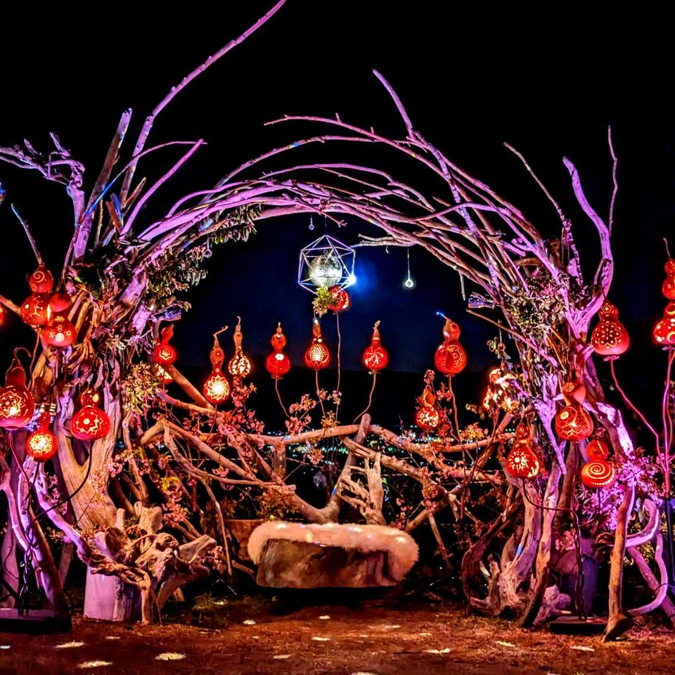 流木や季節の花、その辺の植物による造形にオリジナルのひょうたんランプを融合させて唯一無二の空間つくり出す。