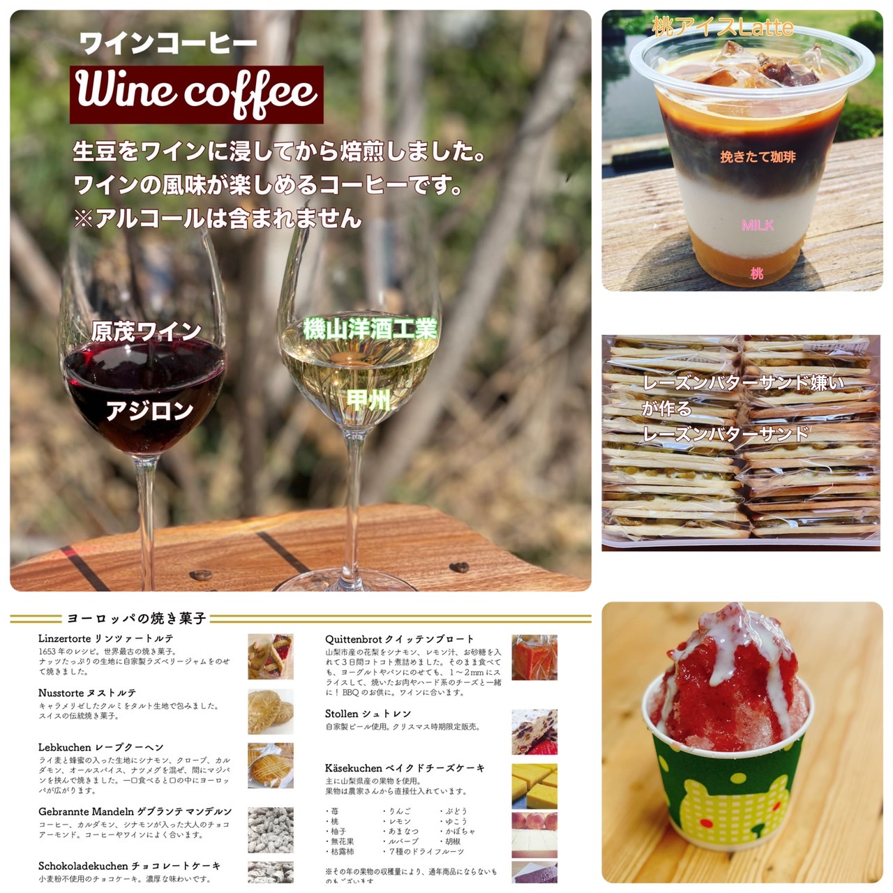 自家焙煎珈琲、ヨーロッパ菓子、地元の果物を使った自家製シロップかき氷、こだわりのアルコールをご用意してお待ちしております。
