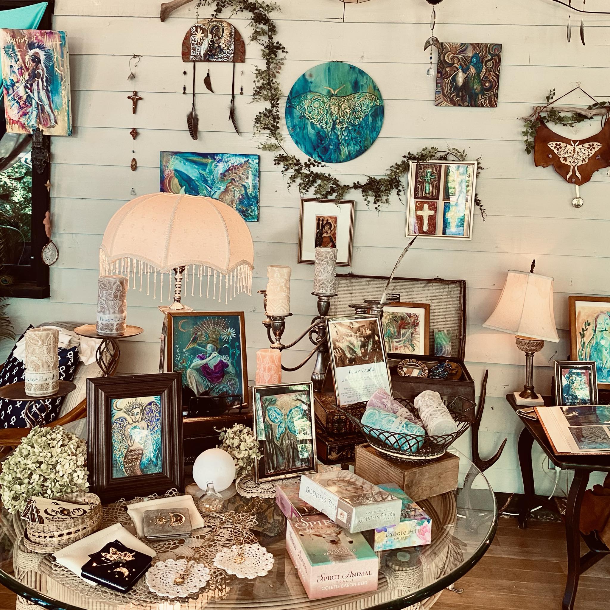 インテリア・アート・天然石ジュエリーなど夫婦のハンドメイド作品や、セレクトのヴィンテージアイテムたちを並べます。